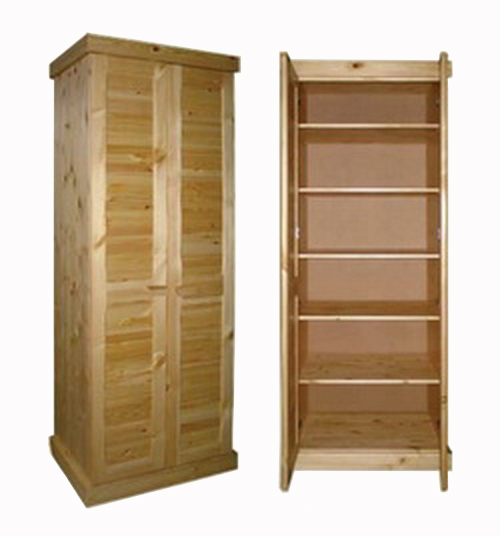Шкаф на две двери выполнен из массива янтарной сосны, придающего изделию особой прочности и высокой износостойкости. Поверхность покрывается прозрачным лаком, препятствующим загрязнению мебели и образованию царапин. Каждый из элементов, толщина которых достигает 5 см, подвергается тщательной отделке.