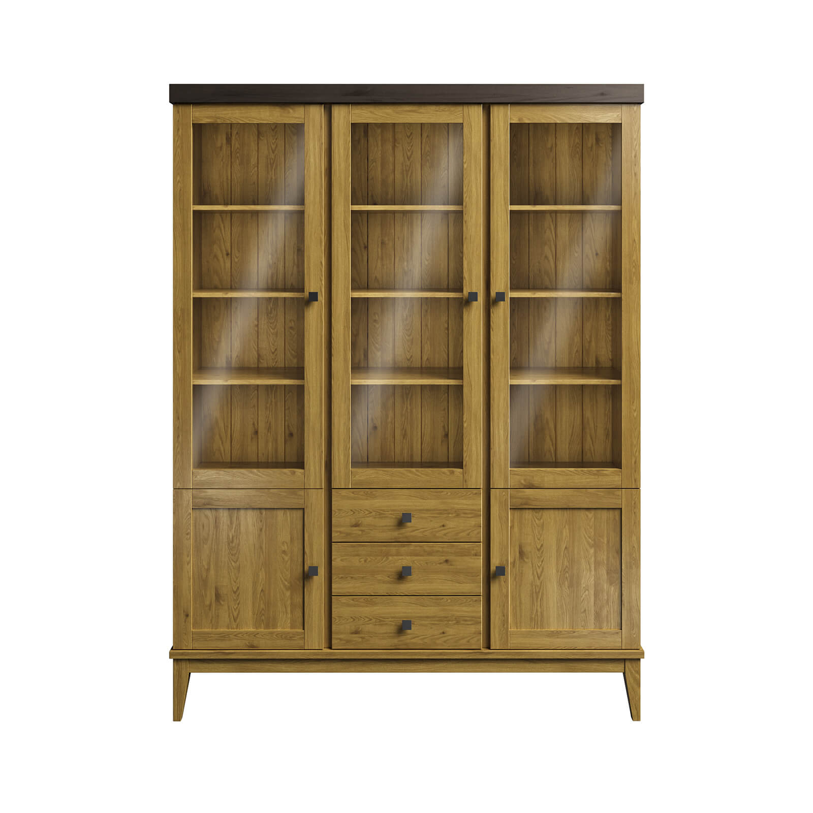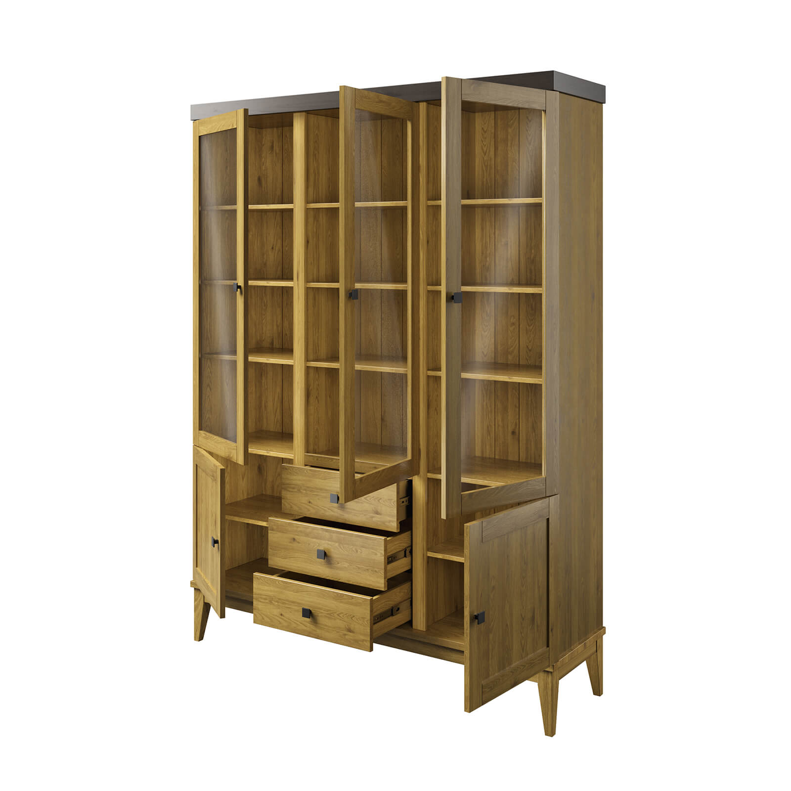По центру внизу три ящика, которые перемещаются на направляющих полного выдвижения и две глухие дверцы.
