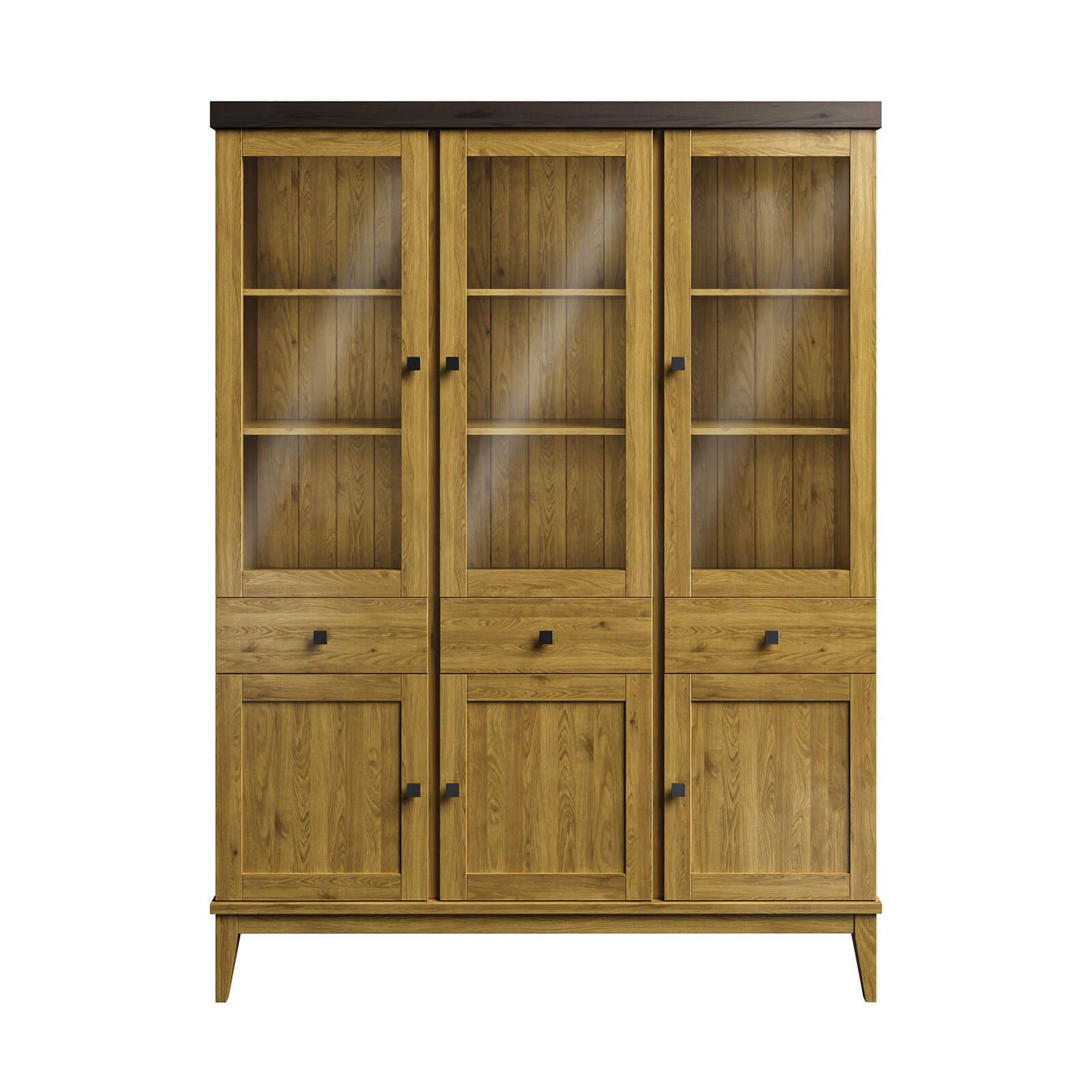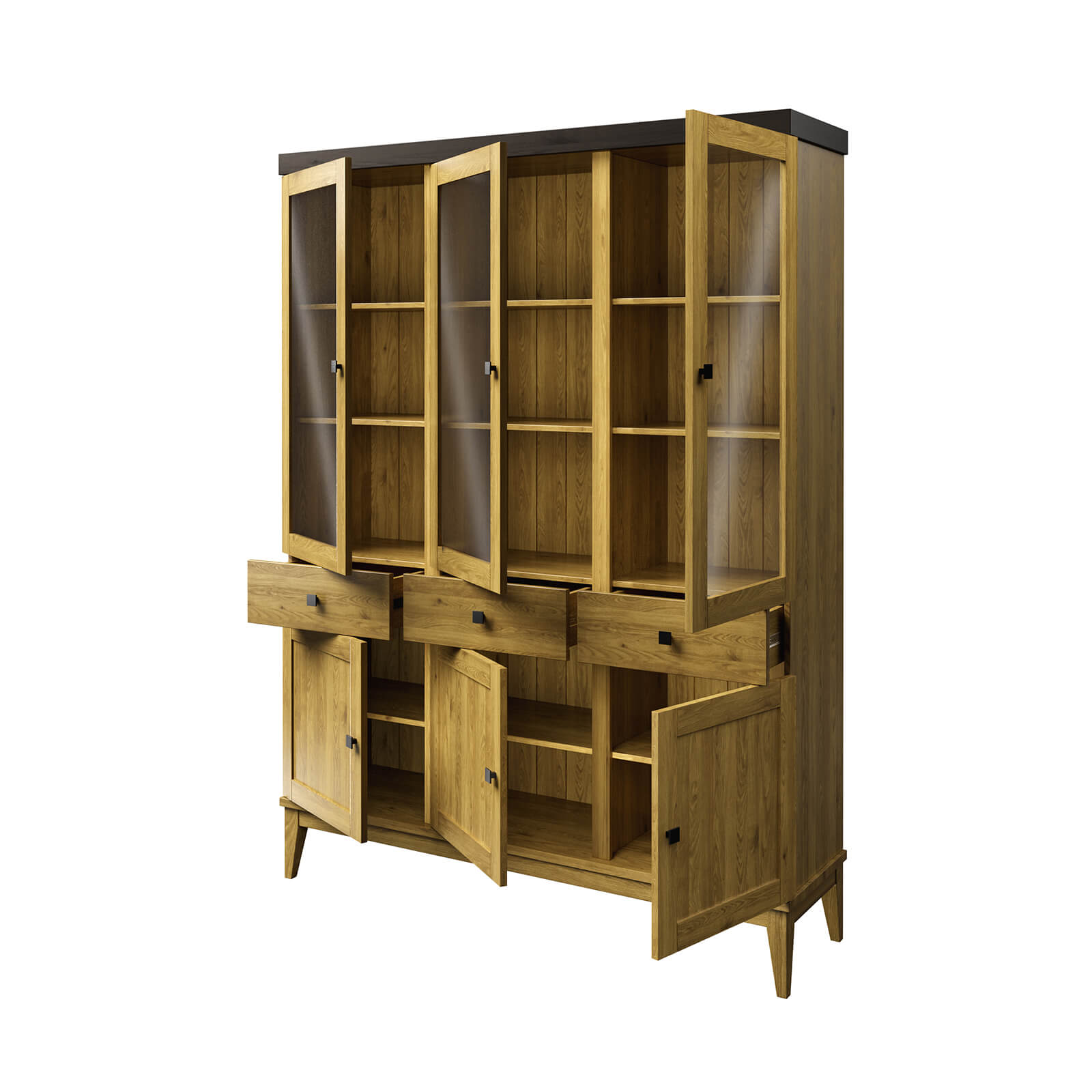 По центру внизу три ящика, которые перемещаются на направляющих полного выдвижения и две глухие дверцы.
