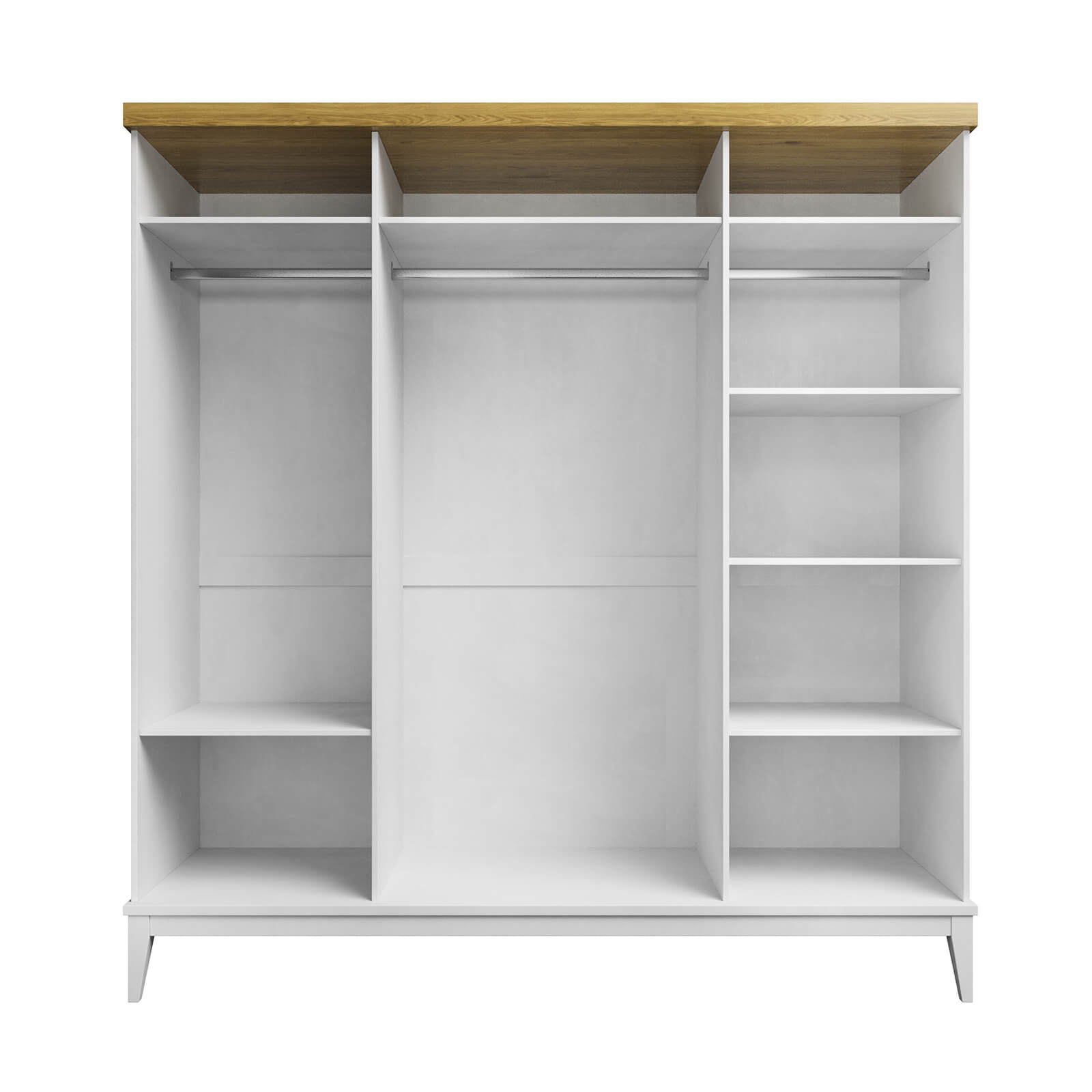 Комбинированный - три отделения - все оборудованы штангами для вешалок и полками для головных уборов плюс дополнительные полки для белья