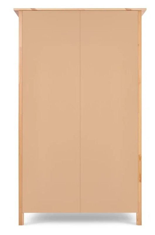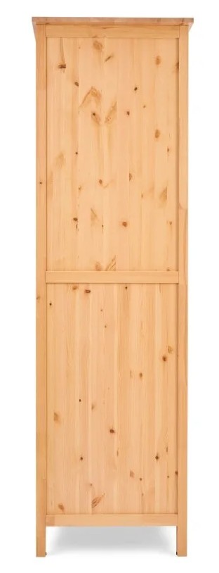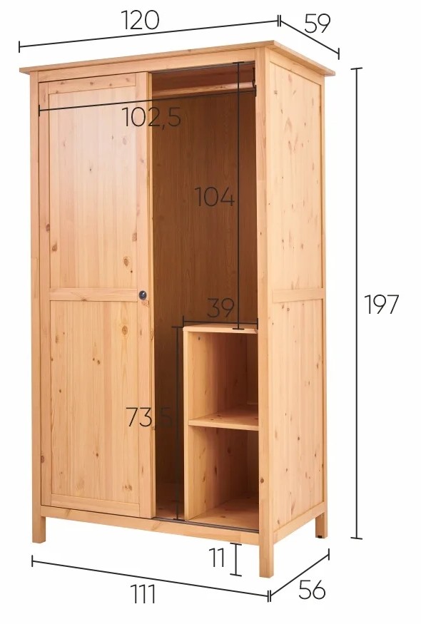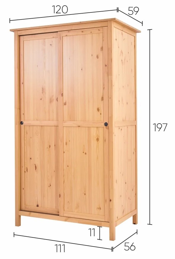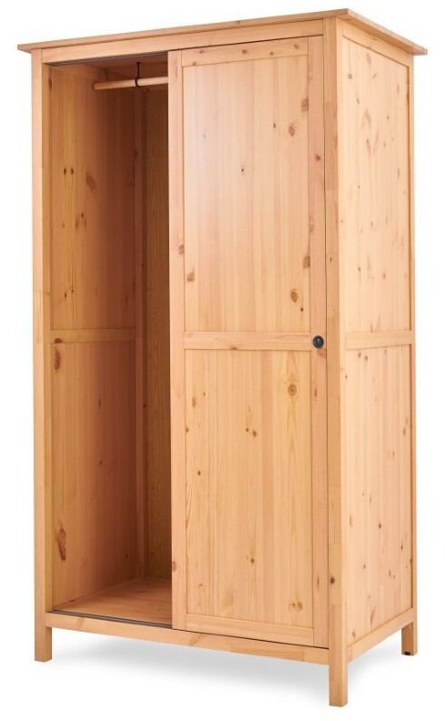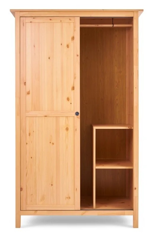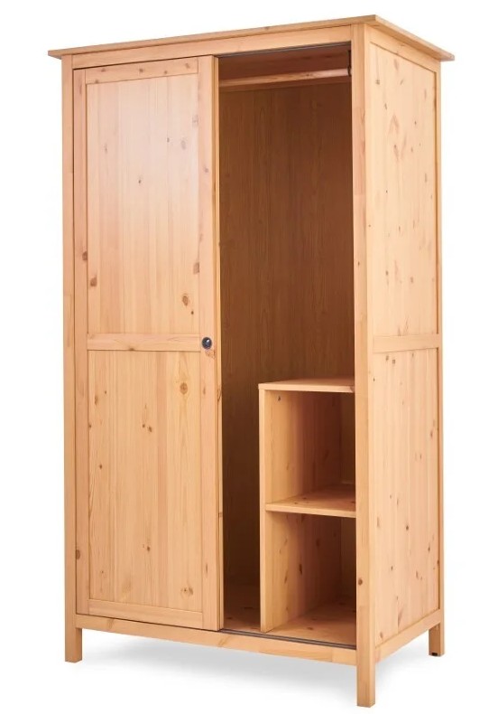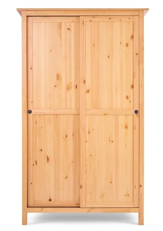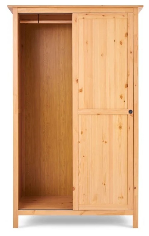 Оборудован раздвижными дверями, полками и штангой для вешалок. Изготовлен из массива сосны.