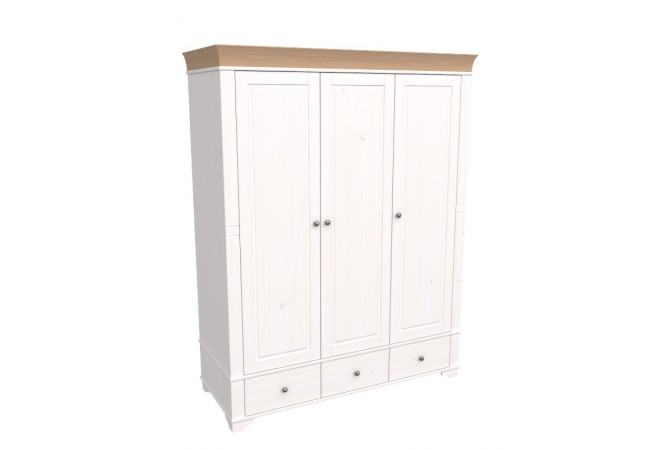 Шкаф 3х дверный Бейли с глухими дверями белый воск/антик - три выдвижных ящика, левое и правое отделение с полкой и штангой, среднее отделение с полками.