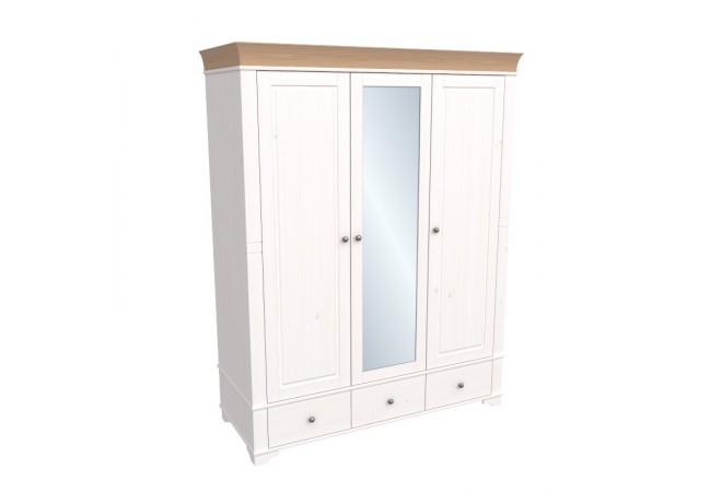 Шкаф 3х дверный Бейли с зеркалом белый воск/браун(антик) - три выдвижных ящика, левое и правое отделение с полкой и штангой, среднее отделение с полками и зеркальной дверью