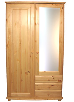 Шкаф Фалько-1 без антресоли с зеркалом. Комбинированный шкаф - массив сосны. Покрыт лаком - неокрашенный шкаф - под заказ - предоплата 50%. Платяное отделение плюс отделение с двумя полками за малой дверцей. Три ящика на роликовых напраляющих.