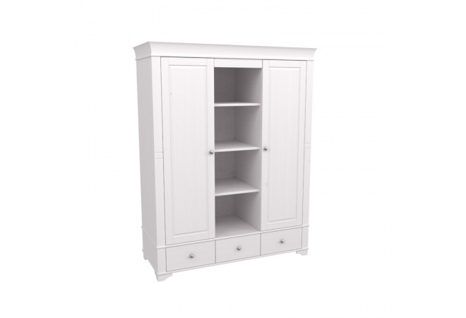 три выдвижных ящика, левое и правое отделение в шкафу с полкой и штангой.