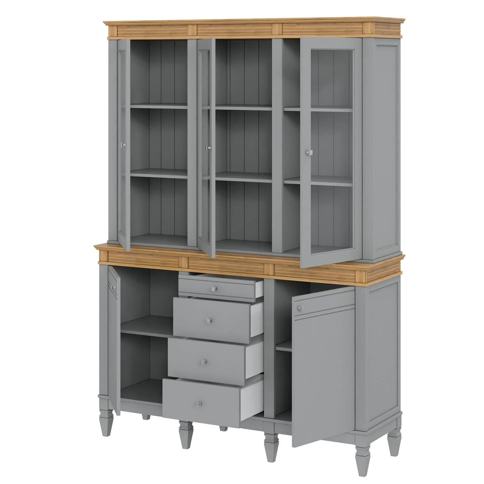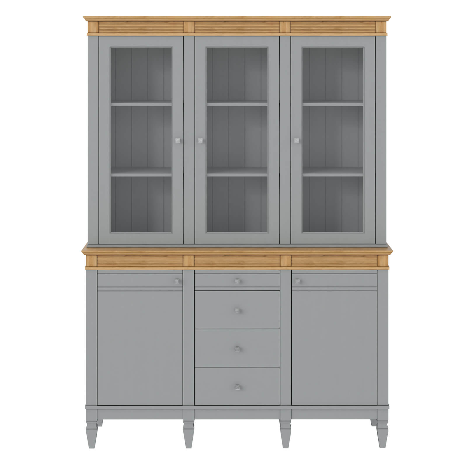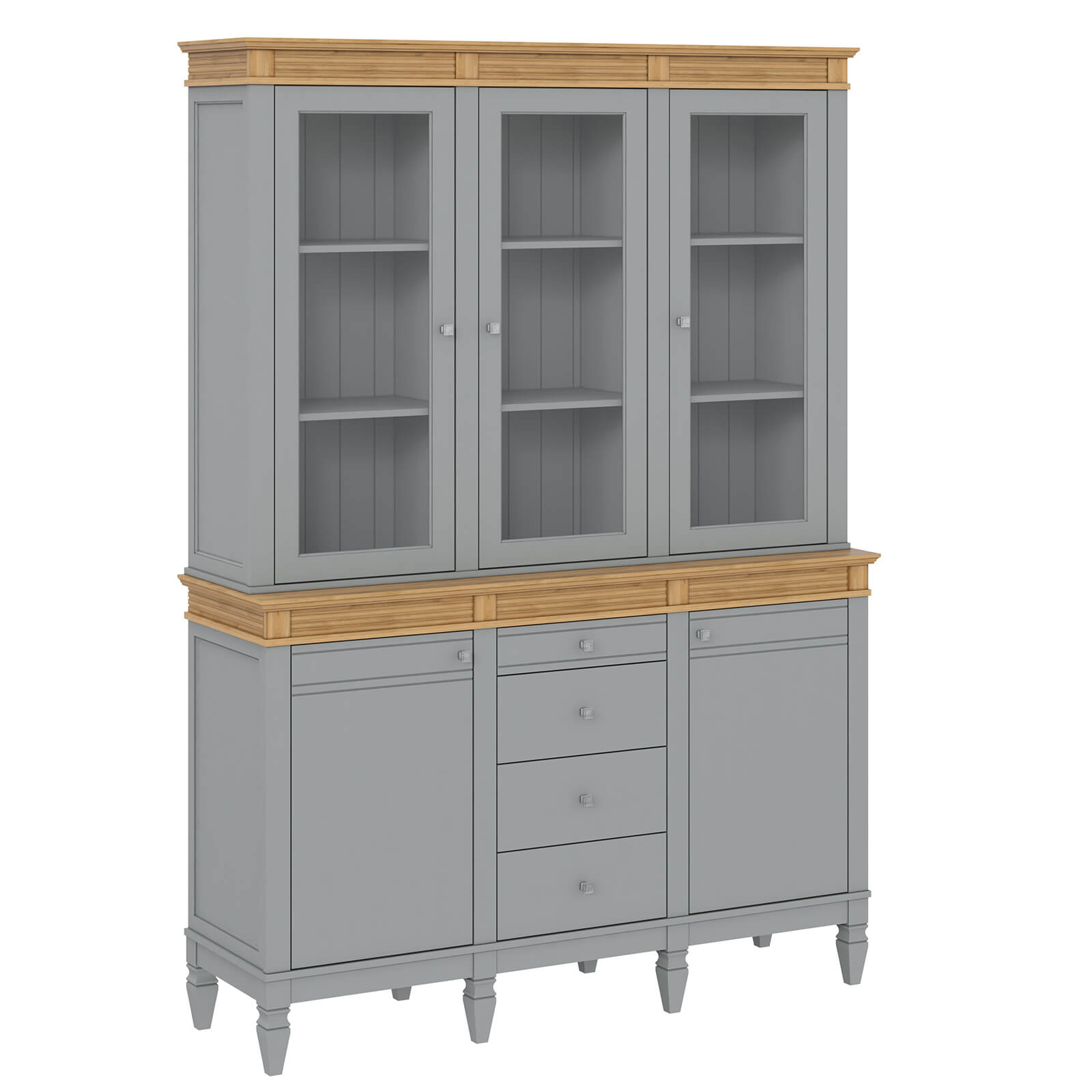 Буфет Ольса 330/324 Серый №7042 + антик №24 изготовлен из массива сосны. Буфет визуально поделен на 3 секции, которые укомплектованы шестью полками сверху, две полки снизу за двумя распашными дверями, 3 стеклянные верхние двери и 4 ящика. Задняя стенка из вагонки.