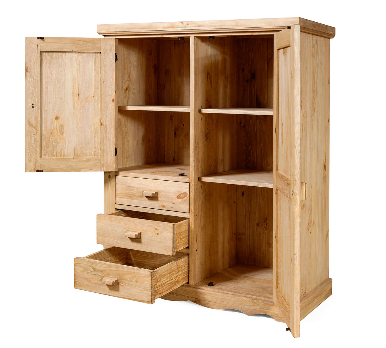 За дверкой слева полка, за дверкой справа 2 полки, 3 выдвижных ящика на деревянных полозьях.
