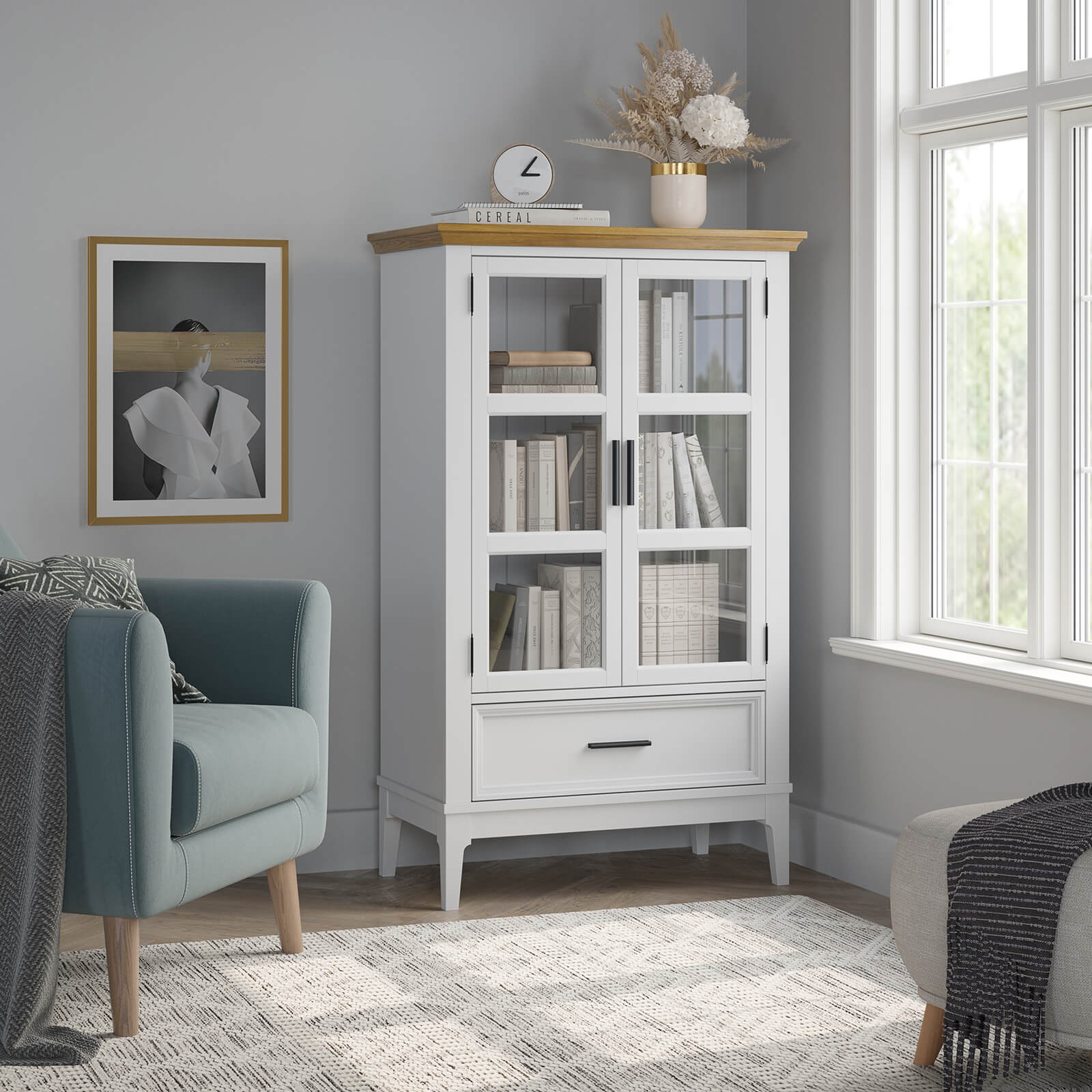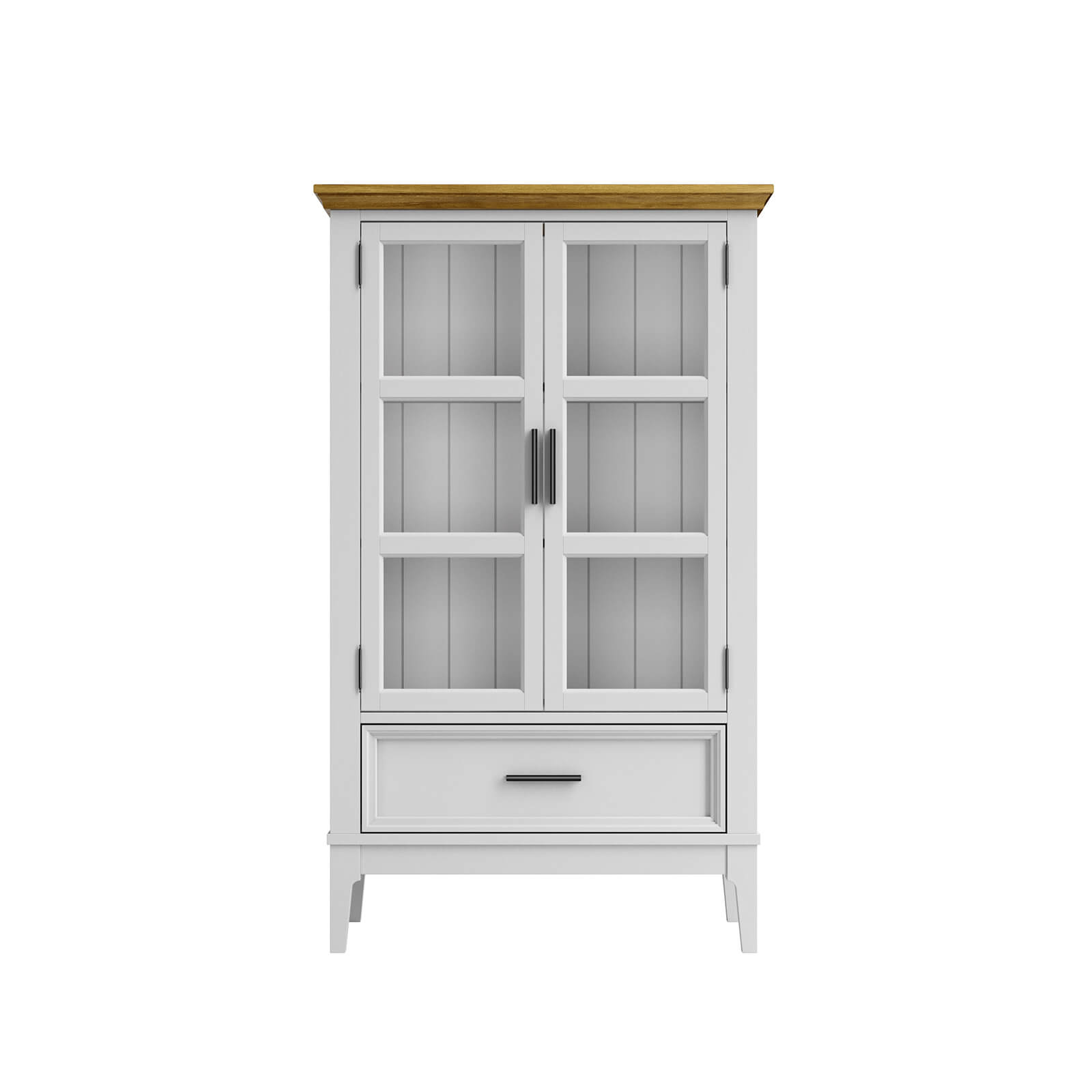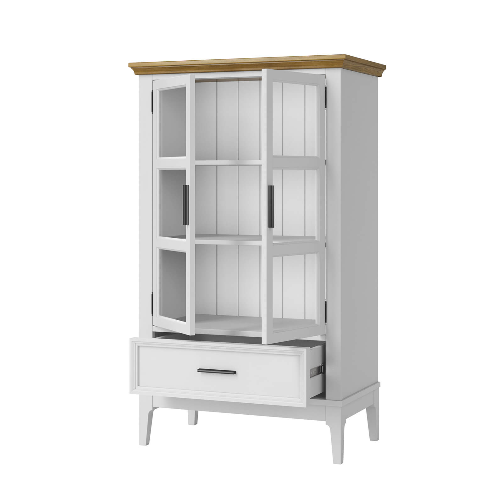 Две распашные застекленные двери и ящик на телескопических шариковых направляющих.
