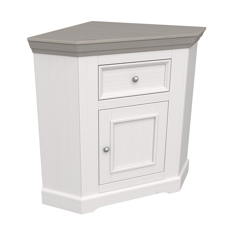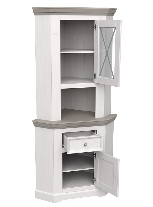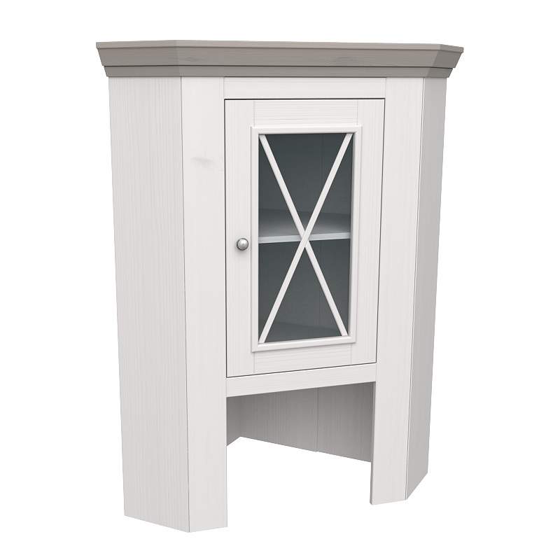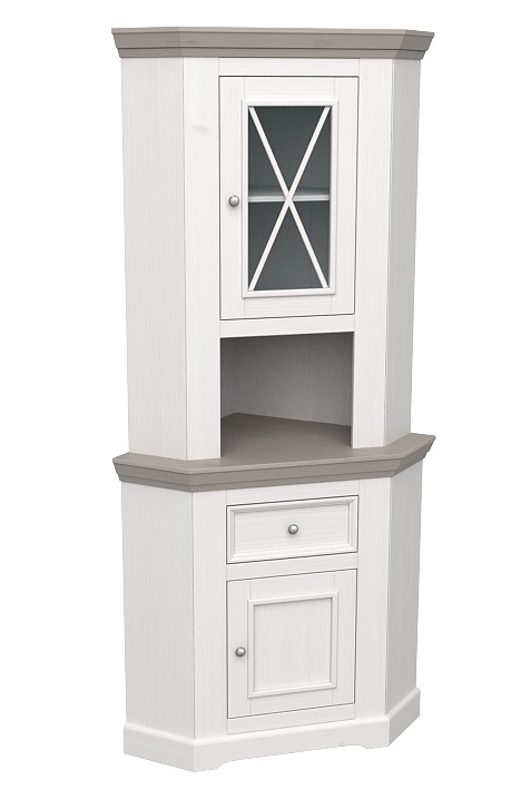 Угловой буфет Форест из массива сосны. Состоит из нижней угловой тумбы плюс верхняя надстройка со стеклянной дверцей. При сборке этой модели можно самому выбрать, на какую сторону навешивать дверцы.