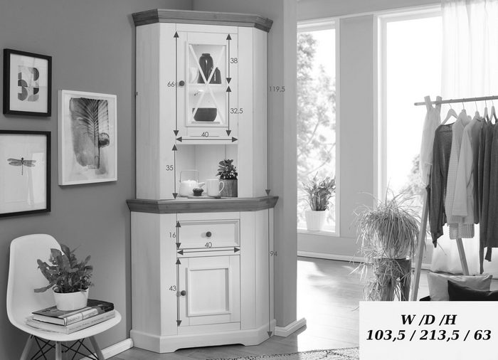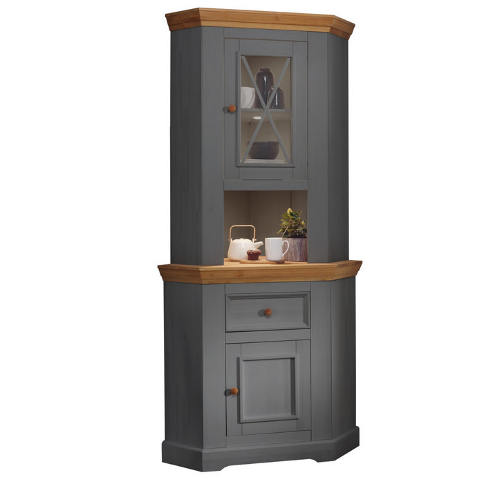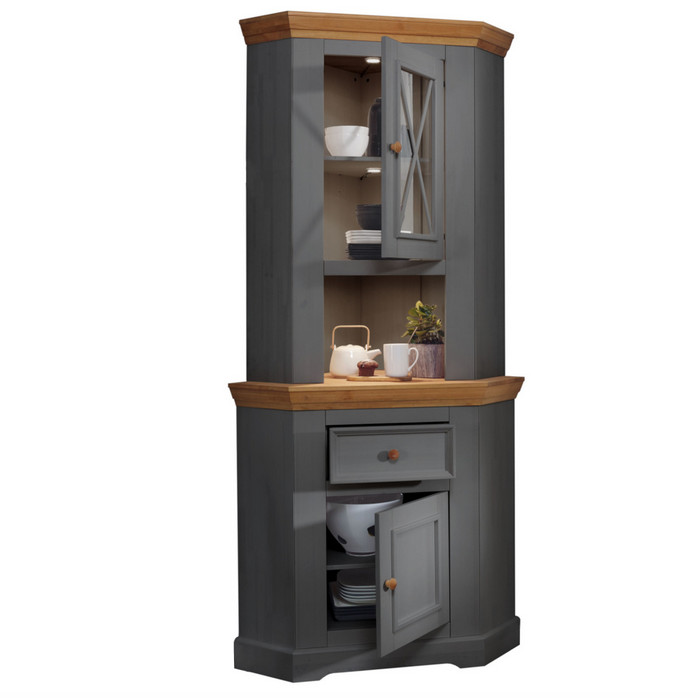Буфет Форест угловой серый 7012/бейц-масло из массива сосны. Состоит из нижней угловой тумбы плюс верхняя надстройка со стеклянной дверцей. При сборке этой модели можно самому выбрать, на какую сторону навешивать дверцы.