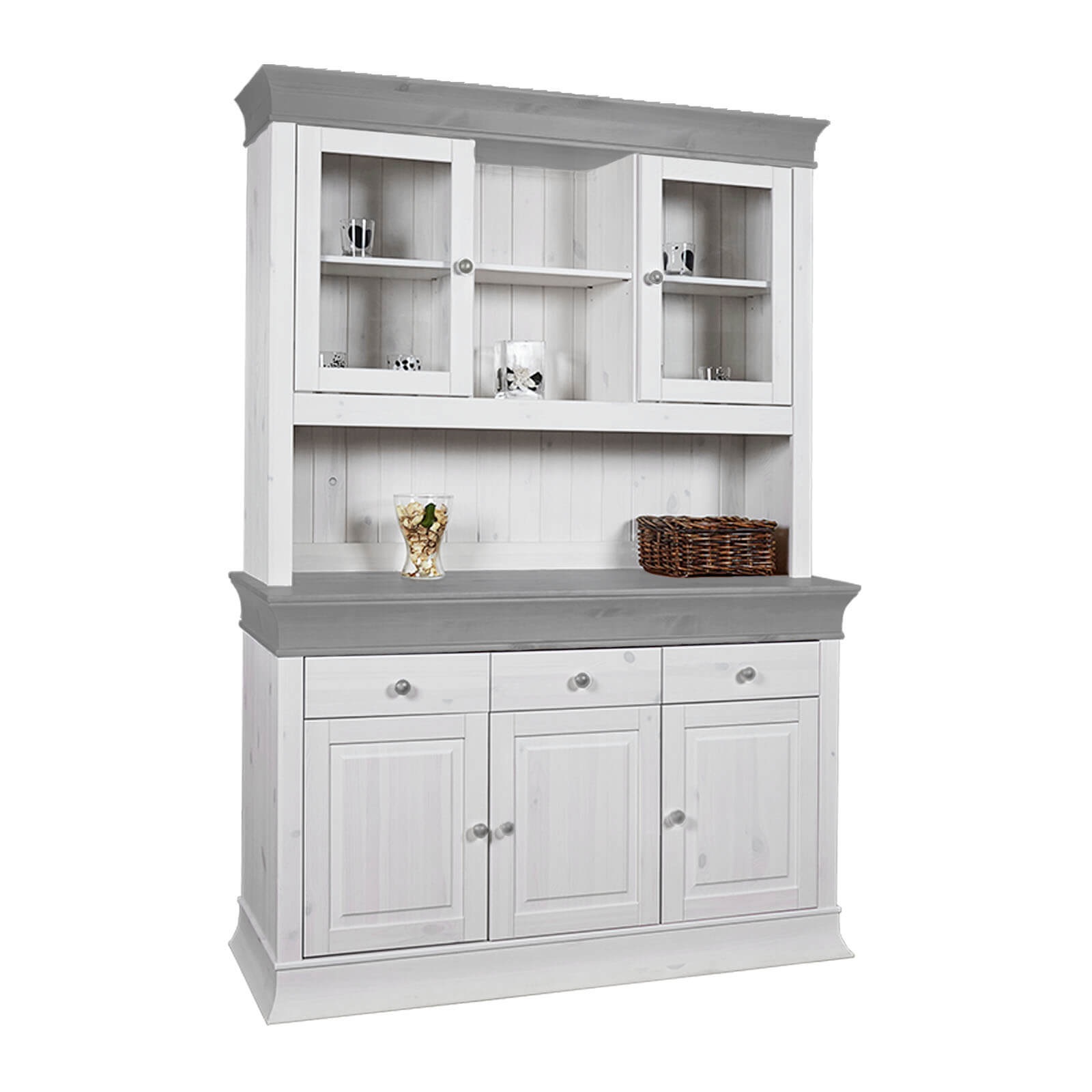 Роскошный деревянный Буфет на кухню Бостон Белый воск + серый , выполненный из соснового массива, отличная возможность наполнить для любую кухню или зал атмосферой домашнего уюта. Модель изготовлена из массива дерева с учетом современного стиля, благодаря чему, буквально, трудно от неё отвести взгляд.