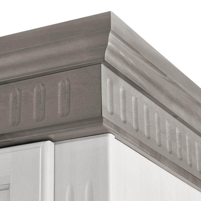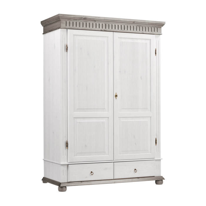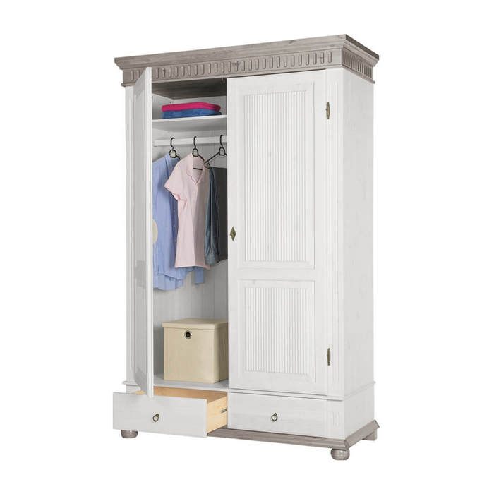 шкаф из сосны Хельсинки 2-GT-M с ящиками платяной отделка белым воском, разделенная филенка на дверцах.
