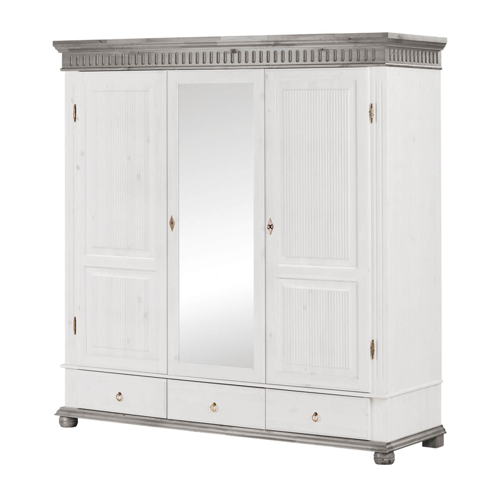 Высокий комбинированный трехдверный Шкаф Хельсинки 3-SP-GT- М Белый воск+серый из массива сосны в спальню или гостиную.