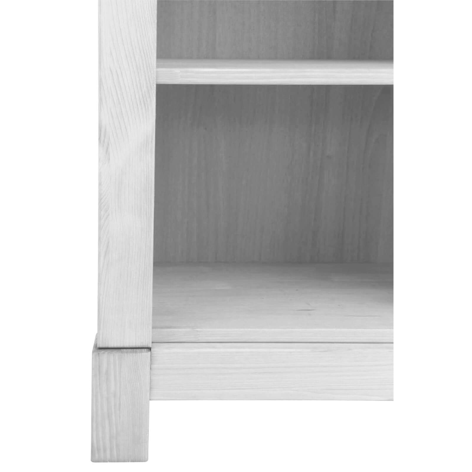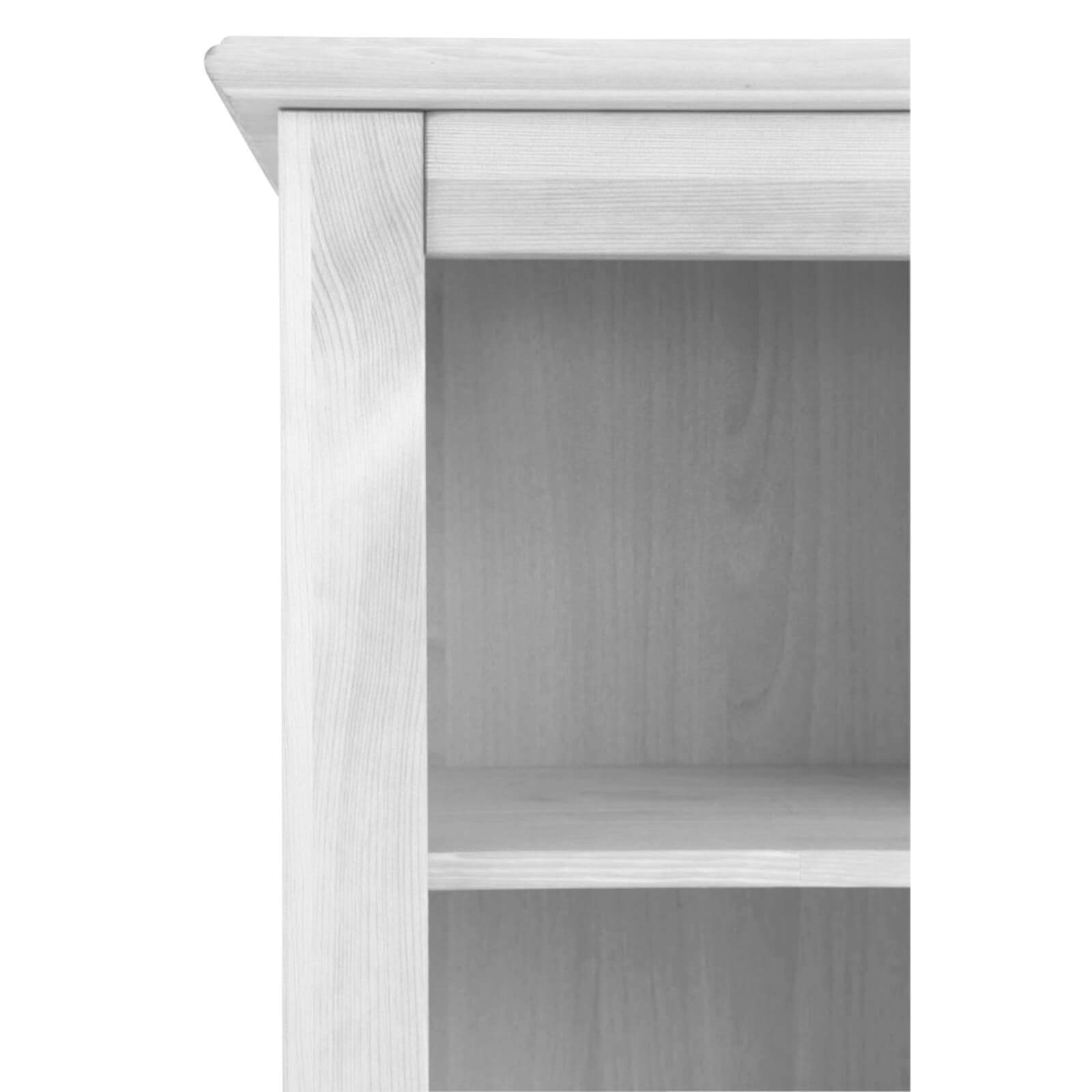 Шкаф для книг Рауна -00 в отделке (белый воск). Небольшой открытый книжный шкаф выполнен из массива сосны, предлагается на выбор покупателей ещё два варианта обработки древесины шкафа.