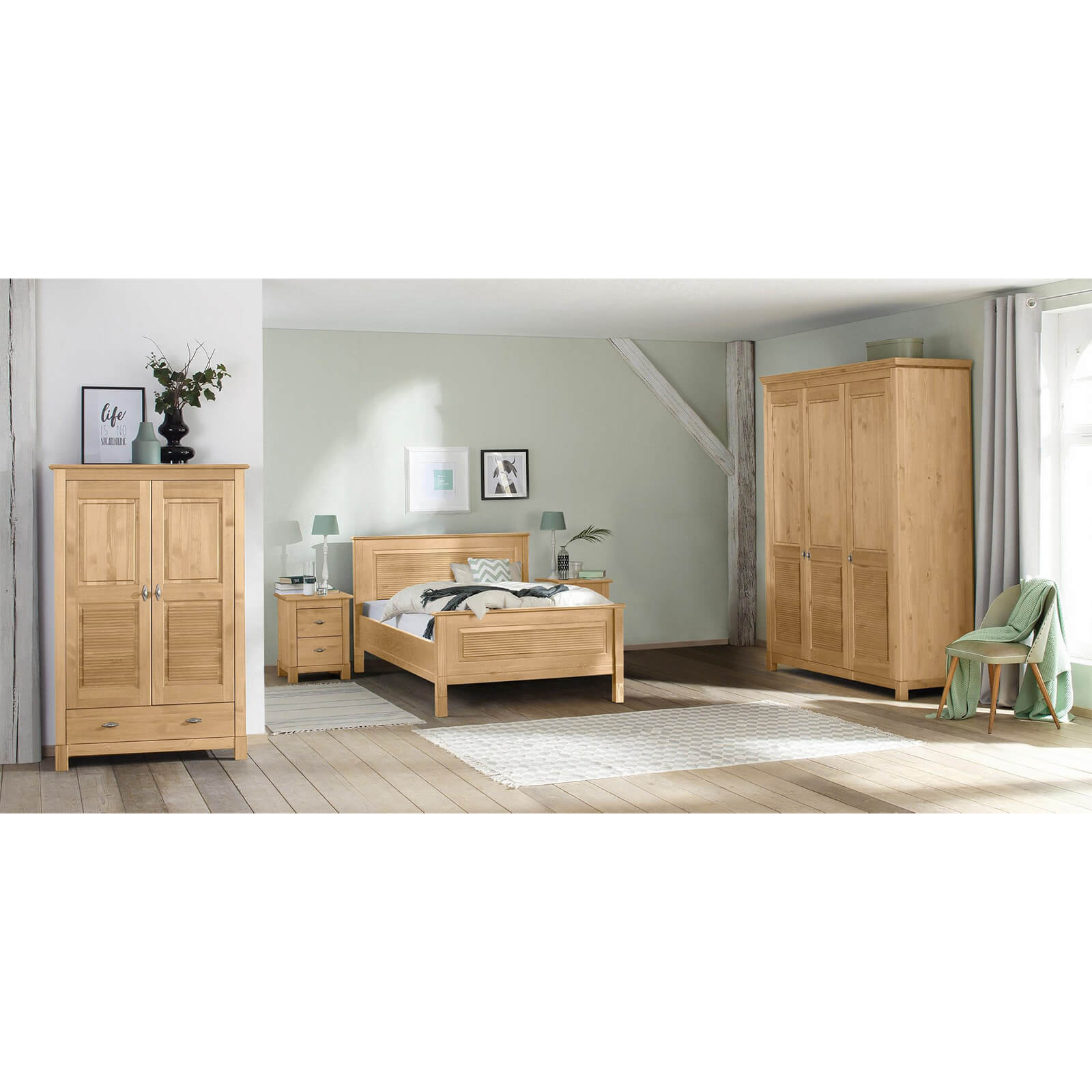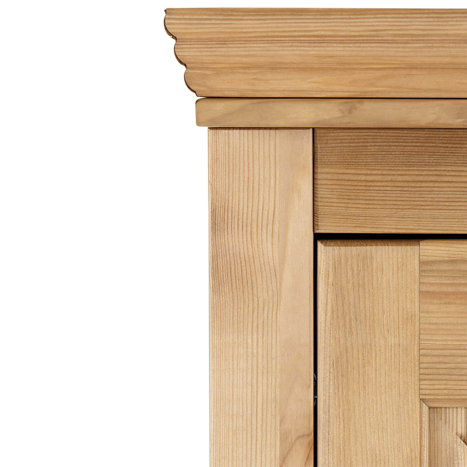 Внутри имеются полки и штанга для вешалок для удобной организации вашей одежды. Массив сосны, использованный при изготовлении, обладает прекрасными декоративными свойствами. Его теплый и натуральный оттенок придаст вашей комнате уют и гармонию.