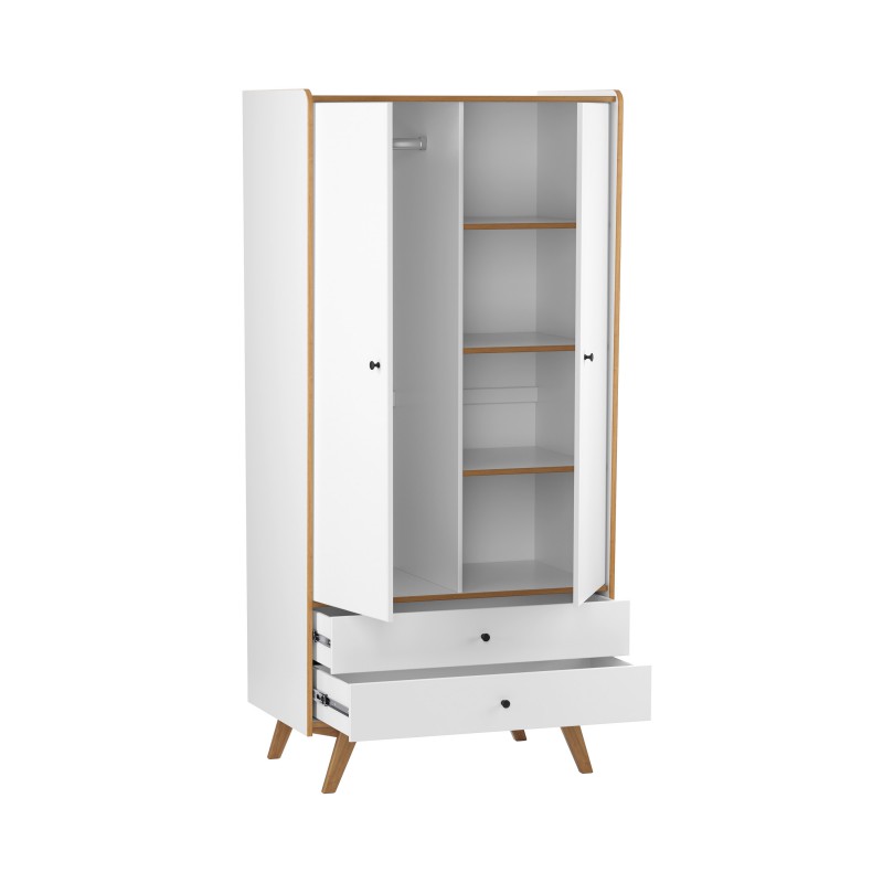 Шкаф имеет 2 ящика на шариковых направляющих с доводчиками и 2 дверки. За правой дверкой расположены три полки, за левой дверкой расположена штанга. Петли дверей с доводчиками.