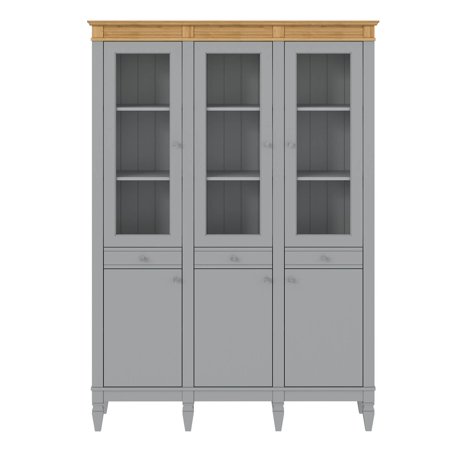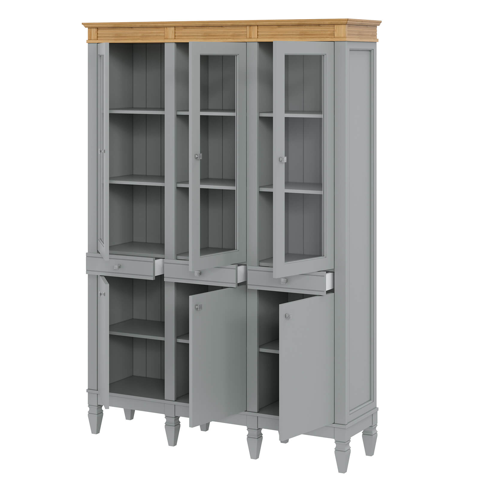 Деревянный стеллаж из сосны / кухонный буфет Ольса-303/330 серый №7042 + антик №24 массив сосны, 3 вертикальные секции , в каждой по 4 полки и 3 стеклянные двери и 3 глухие дверцы, 3 ящика над ними.