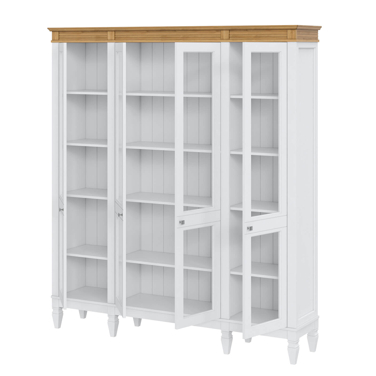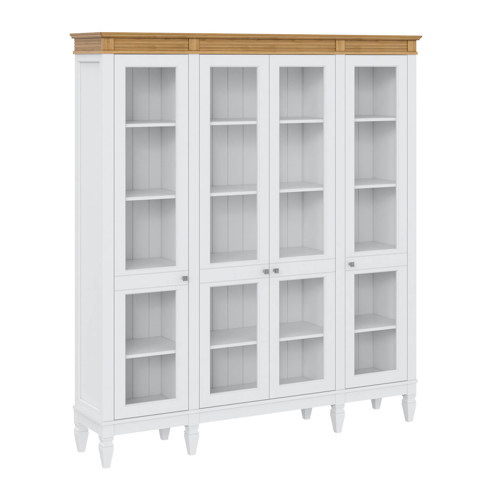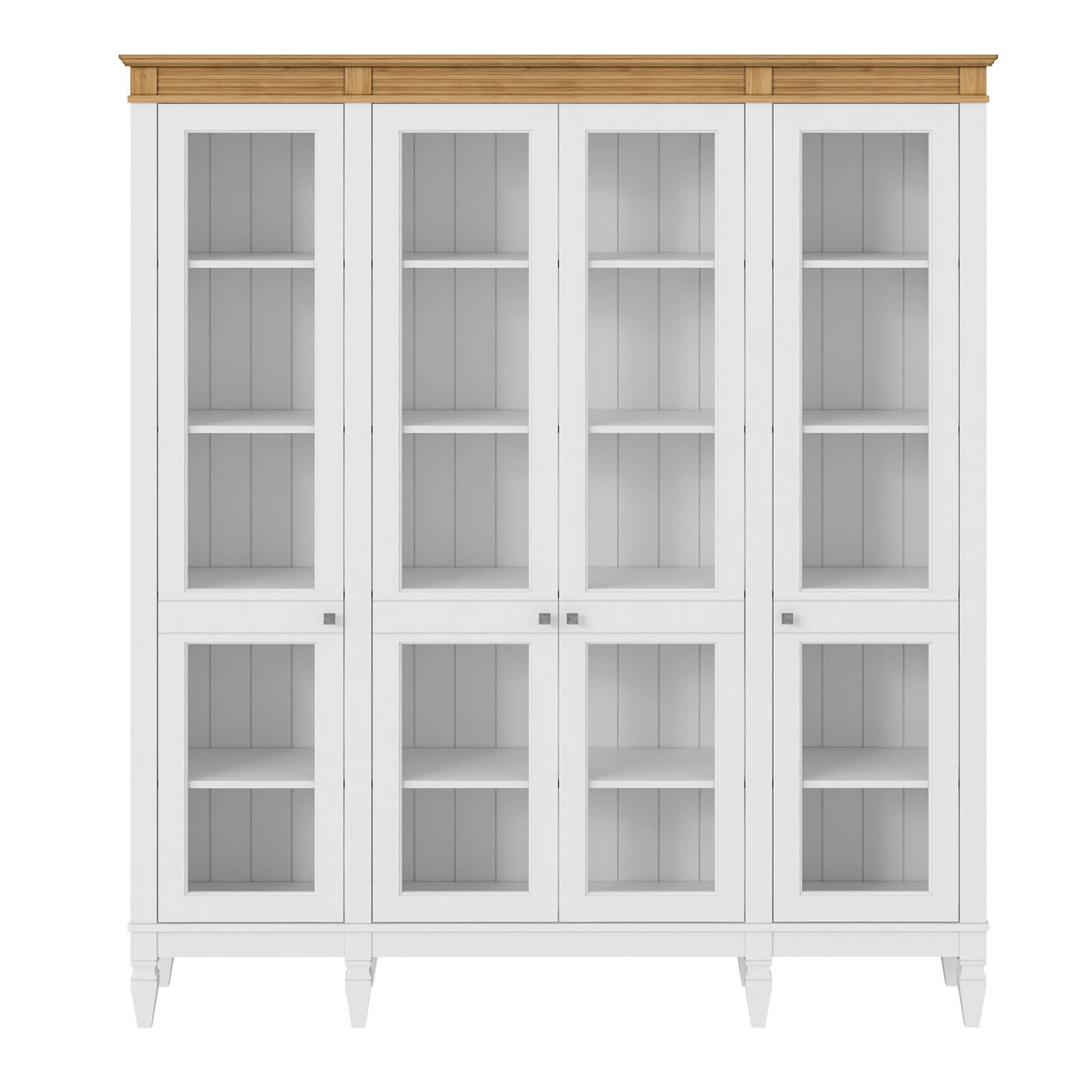 Деревянный стеллаж из сосны / кухонный буфет Ольса-440/000 Белый лак + антик №24 массив сосны, визуально разделен на три вертикальных секции с 4 полками. Оснащен четырьмя стеклянными распашными стеклянными дверками.
