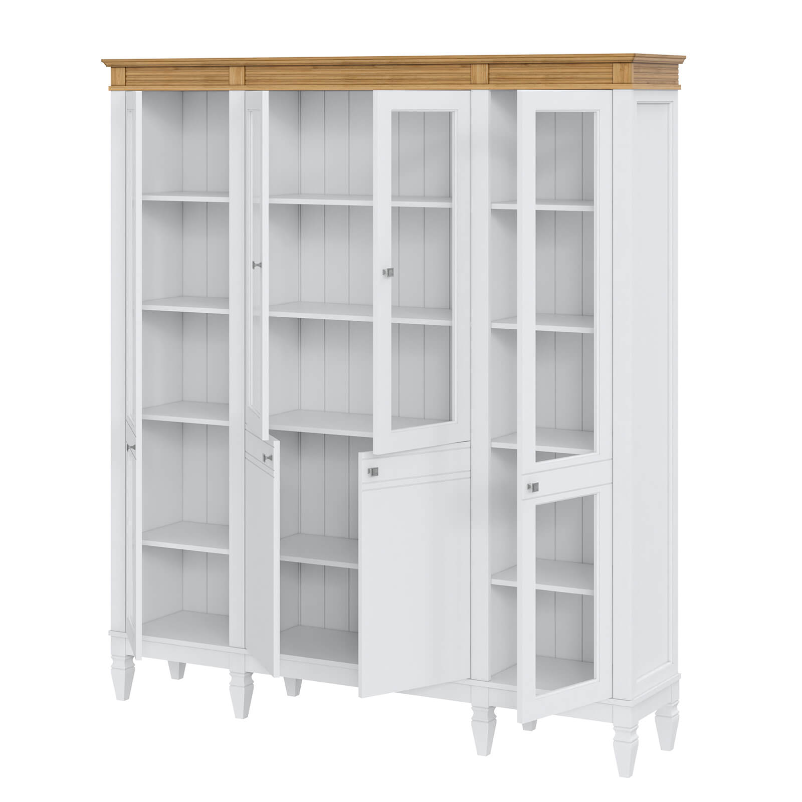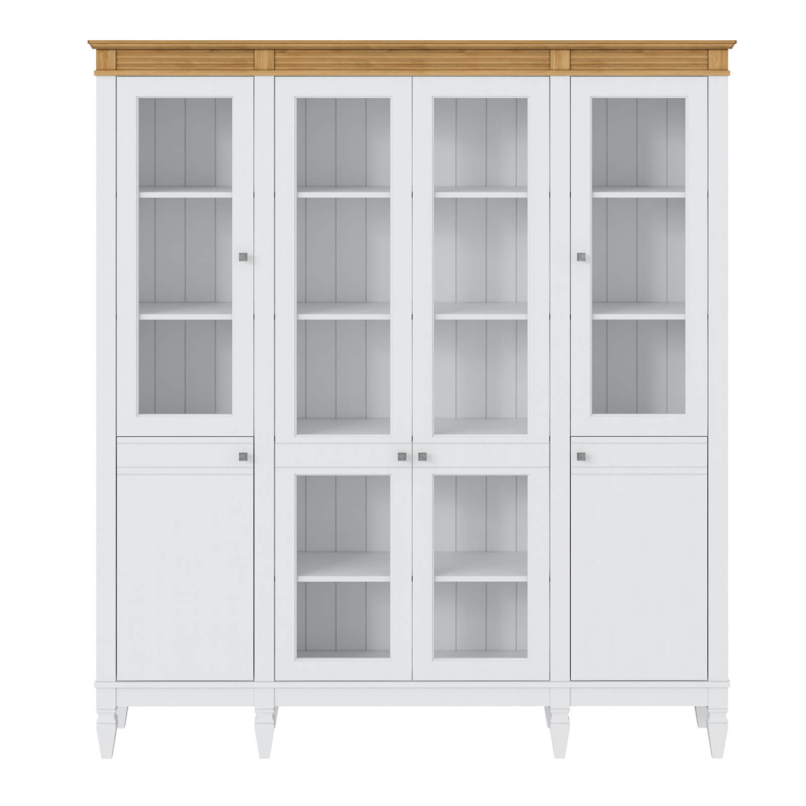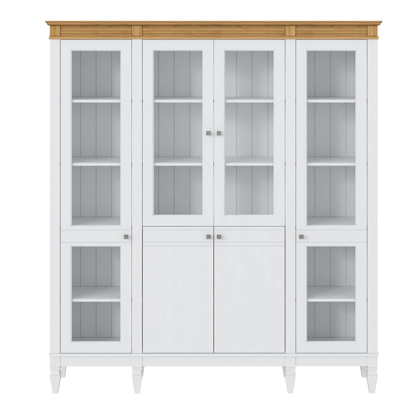 Деревянный стеллаж из сосны / кухонный буфет Ольса-422/200 Белый лак + антик №24 массив сосны, визуально разделен на три вертикальных секции с 4 полками. Оснащен четырьмя стеклянными распашными стеклянными и двумя глухими дверками.