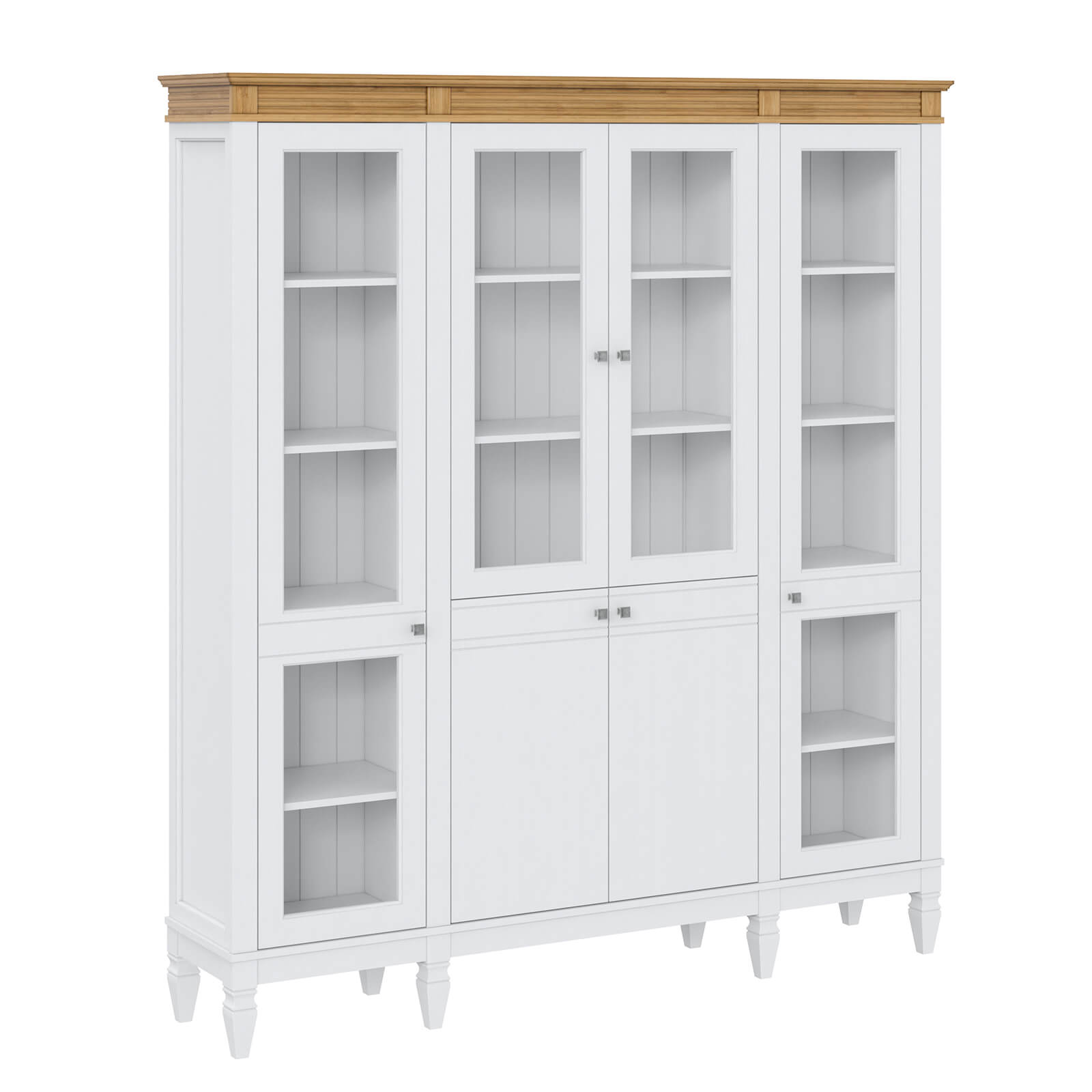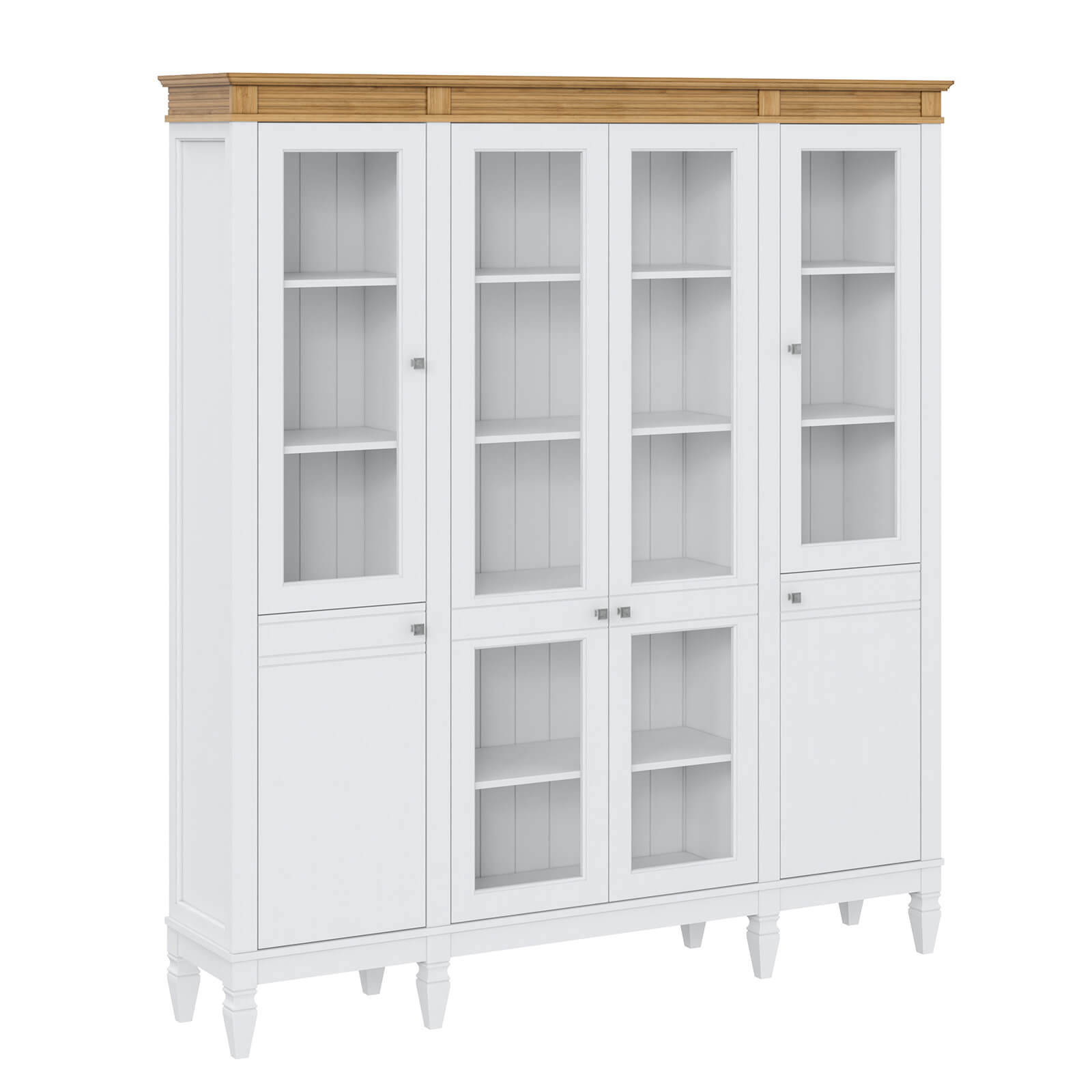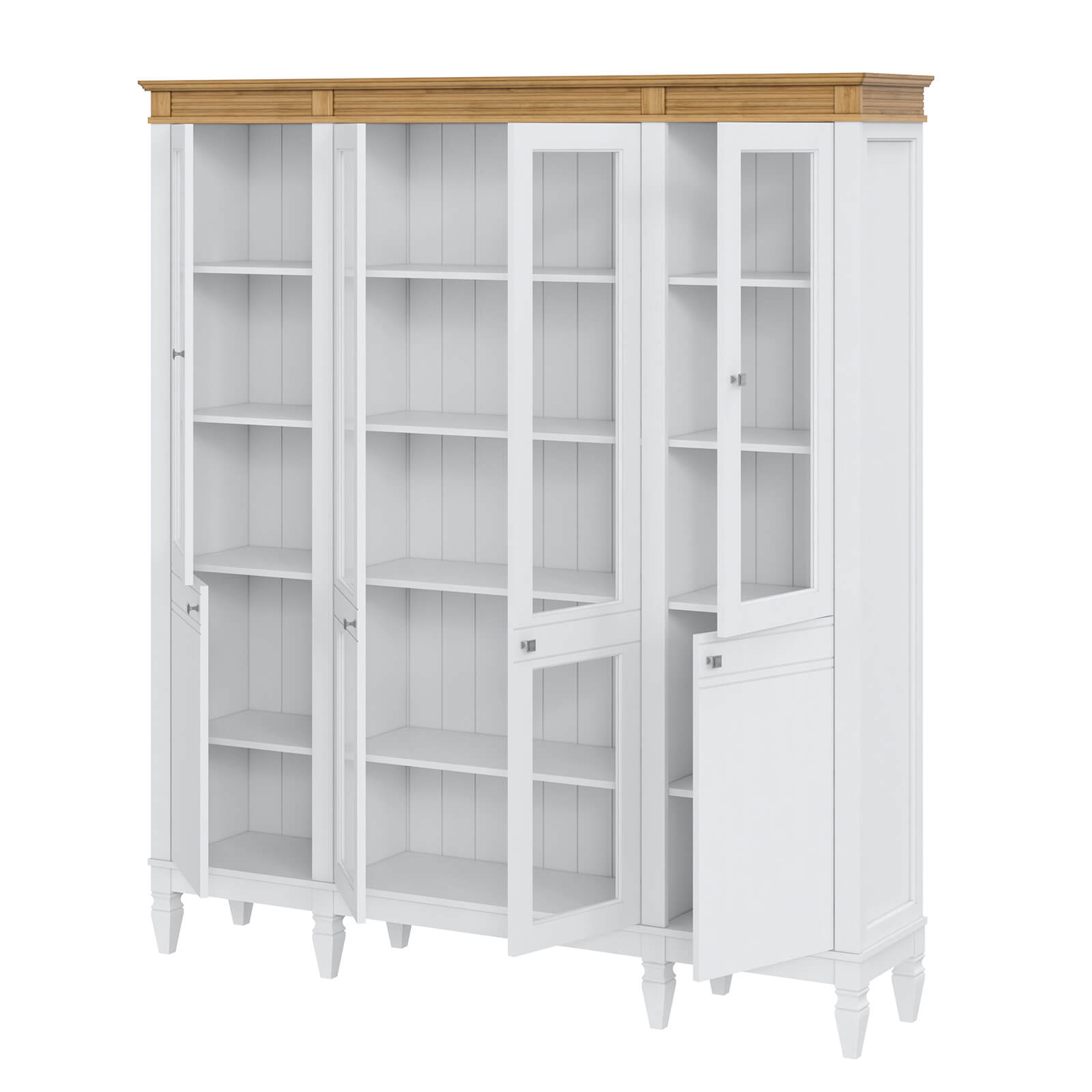 Деревянный стеллаж из сосны / кухонный буфет Ольса-422/200 Белый лак + антик №24 массив сосны, визуально разделен на три вертикальных секции с 4 полками. Оснащен четырьмя стеклянными распашными стеклянными и двумя глухими дверками.