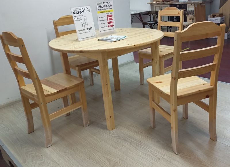 Обеденный стол , покрыт бесцветным лаком. Круглая столешница диаметром 110 см.