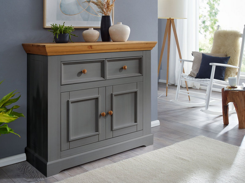 Комод буфета 2 двери 2 ящика Форест серый 7012/бейц-масло из массива сосны. Можно использовать как самостоятельный предмет мебели, так и совместно с надстройкой малого буфета. Совместно с настойкой - буфет малый Форест. За дверками комода расположена полка. Для открывания ящиков и дверок используется фурнитура немецкого производства компании Hefele.Комод имеет два ящика на роликовых направляющих и две дверки, за дверками одно отделение с полкой