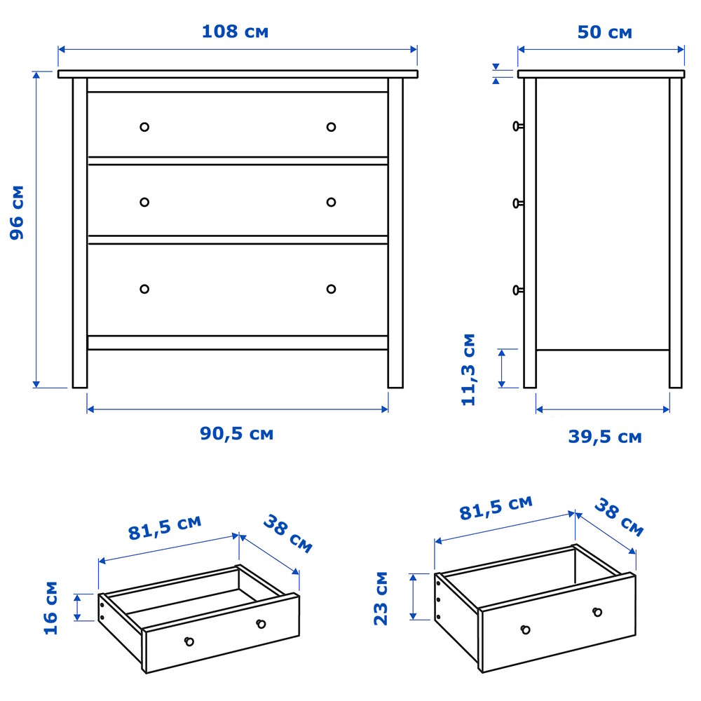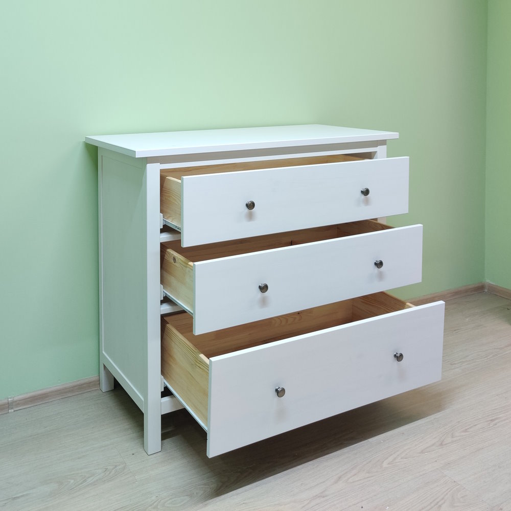 Деревянный Комод с 3 ящиками КАНТРИ (ХЕМНЭС) белый. Изготовлен из массива сосны. Дно ящиков и задняя стенка из оргалита.