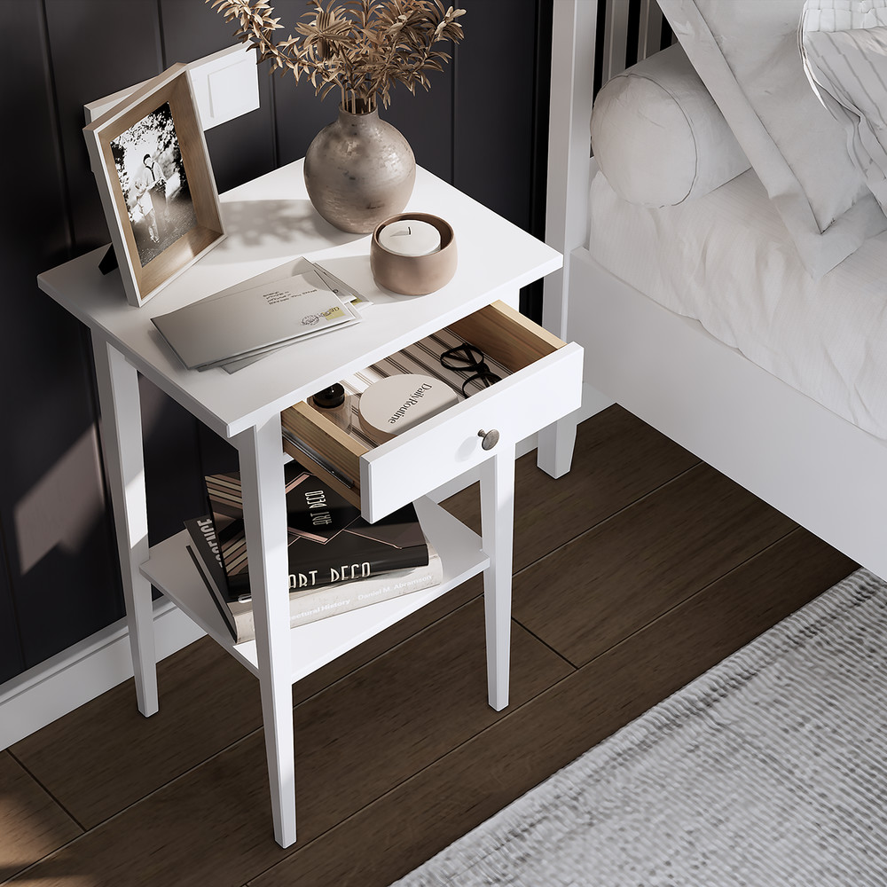 Покрытие выполнено с использованием морилки и лака на водной основе. Верхний ящик на шариковых напрвляющих и нижняя полка предоставляют удобное место для хранения книг, мелочей или других необходимых вещей.