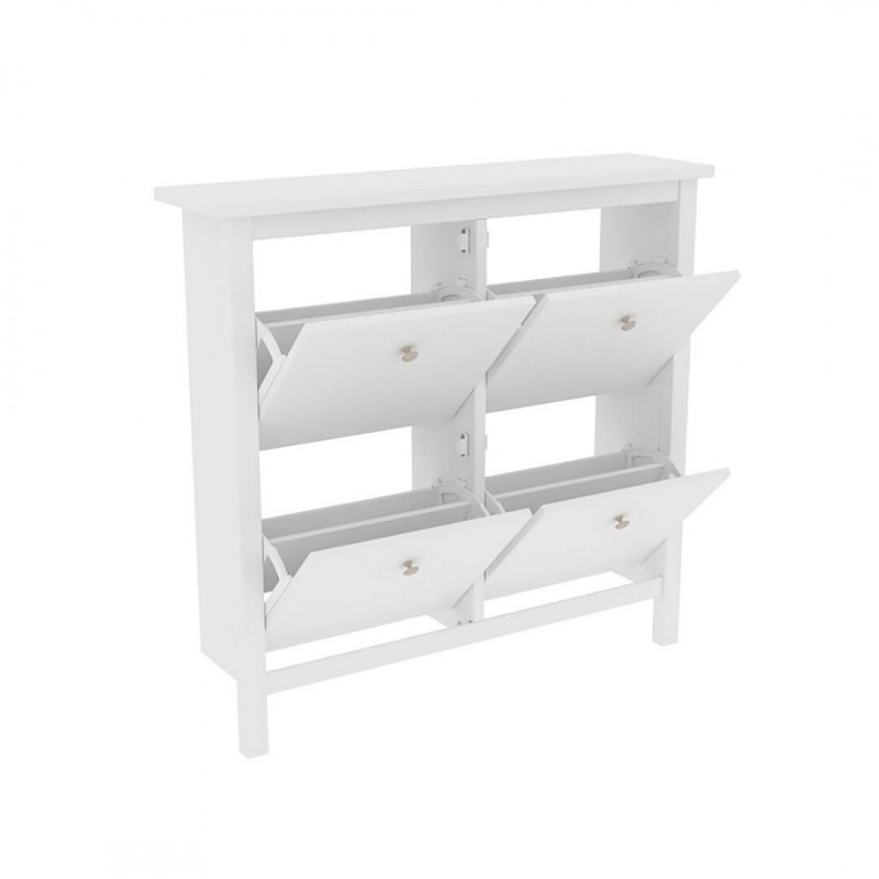 Тумба для обуви Кантри (Hemnes) 04 белая. Четыре отделения с откидными панелями. Изготовлена из массива сосны. Поставляется в разобранном виде. Нижние отделения имеют дополнительную полку для размещения невысокой обуви.
