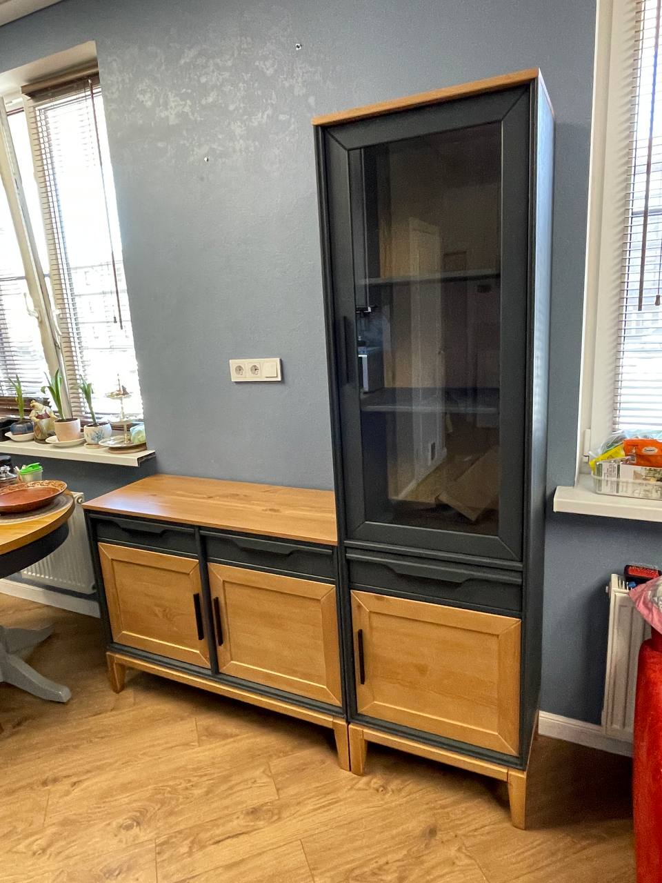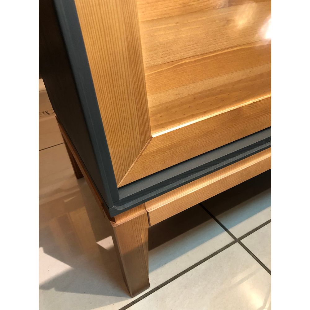 Задняя стенка и донья ящиков сделаны из ДВП. Столешница, дверцы и основание окрашены в цвет «антик», остальные части изделия – в цвете «серый 7016». Через покрытие цвета антик видна природная текстура сосны.